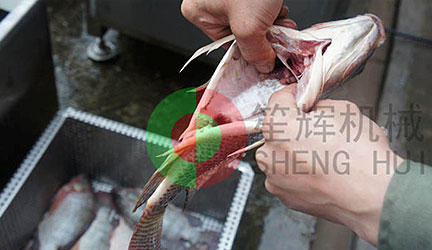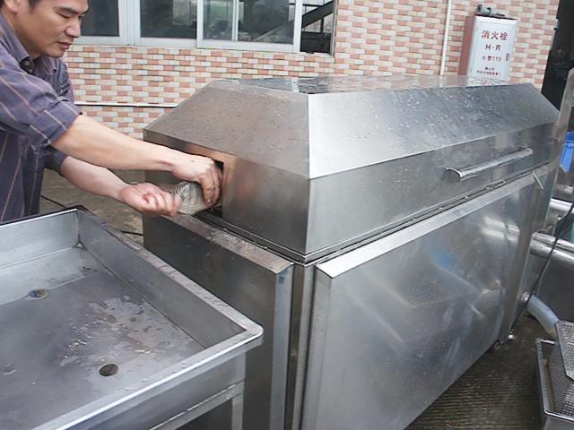 機(jī)內(nèi)有高壓噴淋系統(tǒng),去除魚鱗,沖走內(nèi)臟。