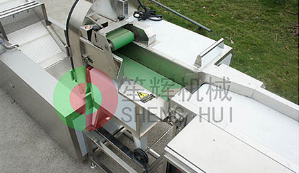 變頻調(diào)速切菜機與上層輸送帶無縫對接,按烹飪規(guī)格對物料進行切割。
