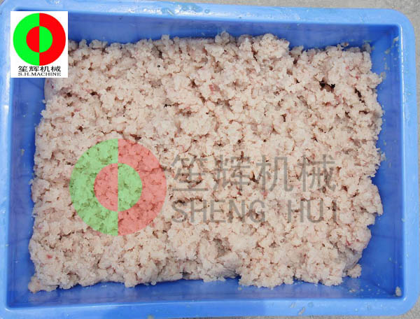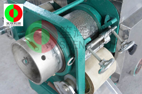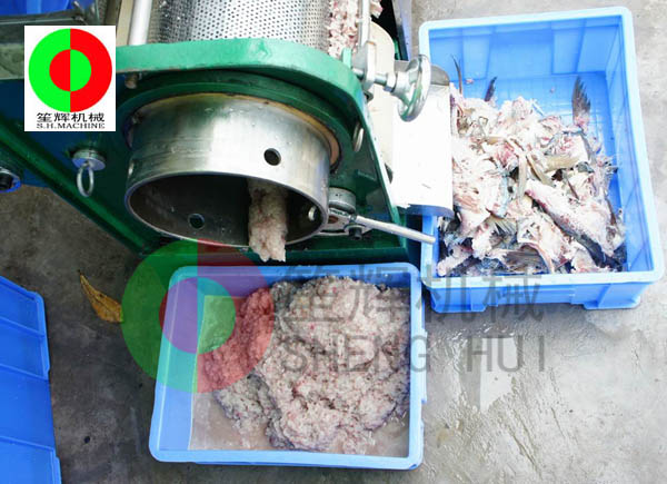 工作原理:人工把待加工的魚先去掉魚頭和取出魚肚中的內臟;對大魚,則需將魚剖分成兩半,漂洗干凈(避免采出來的魚漿被內臟及魚血污染)。隨后將魚片投入到料斗內(魚的剖分面朝向采取筒,背部貼近橡膠帶),魚在橡膠帶的帶動下進入采取筒與橡膠帶的擠壓區,在橡膠帶與采取筒之間的擠壓力的作用下,魚肉被擠壓通過采取筒上的小孔進入采取筒內,采取筒內的魚肉碎粒會隨著旋轉自動送出。而魚皮及魚刺等雜物則被裝在機器上的刮刀從采取筒外延上刮下落在收集槽中。整個采肉分離過程無需人手操作,方便衛生。橡膠帶與采取筒之間的壓力大小,是由位于機器頭部的橡膠帶拉緊裝置調節。調節量的大小可根據魚種的大小靈活調整。提取出來的魚肉可作為魚丸、魚漿,魚醬,魚肉餅,魚餡餃等等食品原料,大大提高魚類經濟價值。