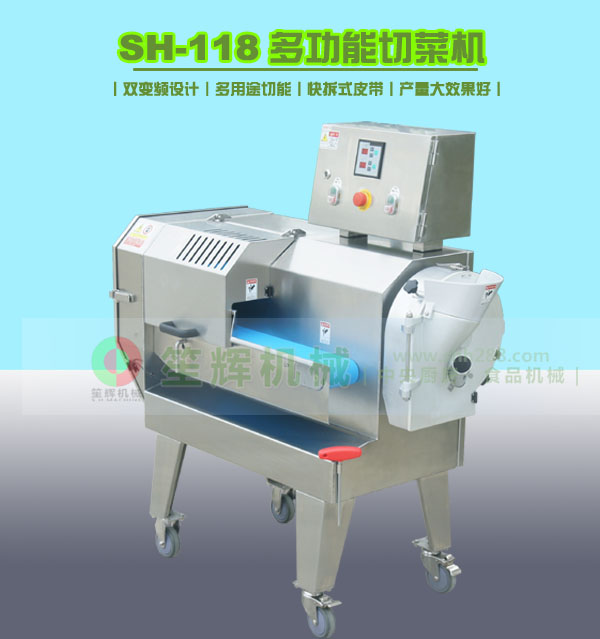 多功能雙頭切菜機SH-118具備雙變頻功能,一頭切葉菜類,如蔥蒜、韭菜、芹菜、白菜、青菜等;另一頭切球根莖類,如蘿卜、土豆、紅薯、芋頭、筍、洋蔥、茄子、蘋果等蔬果類。設備輸送皮帶采用快拆式設計,更換保養比較方便,它一機多用、產量高,切割效果好,機身采用304不銹鋼制造,符合衛生要求;它適于食品加工廠,餐飲行業、單位或學校飯堂、餐飲配送中心等使用。