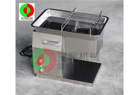 小型臺式切肉機,可將鮮肉切片切絲,也可切熟的豬耳朵、豬腸、牛雜、豬雜等。每小時加工量約250公斤,適合于規模較小的餐飲或肉類加工企業,尤其適合于學府工廠的小型食堂使用。刀具采取外置懸掛式設計,傳動部分由渦輪變速,操作 簡單,洗拆方便,省時省力;如果要加工不同厚薄的肉片,只需換上相應的刀具就可以實現,一機多用。刀具間距可定做。機內裝有保護開關,當刀具外露時, 機器自鎖不能起動。刀片用特鋼材制造,硬度高,經久耐用.